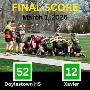 The Doylestown Rugby Academy High School Boys’ Team hosted #5 nationally ranked Xavier High School out of New York City on Sunday, March 1, 2026, at LaSalle College High School. This was Xavier’s first match of the Spring season and Doylestown’s second match. Xavier is a perennial school power and the defending New York state champion. Xavier rightfully plays in the National Championship tournament every year. Xavier’s defense was outstanding for the first 20 minutes of the match as they executed 2-man low strong positive grade tackles over and again. Doylestown was unable to score its first try until the 21st minute of the match. However, the never-ending body blows by Doylestown were too much for Xavier to overcome.