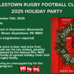 Mens Team News Men Our BoardScheduleClub DuesMatch ResultsLeague StandingsTeam HistoryPhoto GalleryTeam NewsTraining Doylestown Rugby Football Club’s 2025 Holiday Party December 3, 2025 Read More Doylestown Rugby Football Club News – October 13, 2025 October 13, 2025 Read More Doylestown Rugby Football Club News – September 21, 2025 September 21, 2025 Read More Doylestown Rugby Football Club News – September 1, 2025 September 2, 2025 Read More Doylestown Rugby Football Club News – August 25, 2025 August 25, 2025 Read More Doylestown Rugby Football Club News – May 19, 2025 May 19, 2025 Read More Doylestown Rugby Football Club News – April 14, 2025 April 14, 2025 Read More Doylestown Rugby Football Club News – March 31, 2025 April 1, 2025 Read More Doylestown Rugby Football Club News – March 24, 2025 March 24, 2025 Read More Doylestown Rugby Football Club News – March 17, 2025 March 17, 2025 Read More Doylestown Rugby Football Club’s 2024 Holiday Party November 19, 2024 Read More Doylestown Rugby Football Club News – November 11, 2024 November 11, 2024 Read More Doylestown Rugby Football Club News – November 4, 2024 November 4, 2024 Read More Doylestown Rugby Football Club News – October 28, 2024 October 28, 2024 Read More Doylestown Rugby Football Club News – October 14, 2024 October 14, 2024 Read More 1 2 3 … 6 Next » DOYLESTOWN RFC SPONSORS Interested in becoming a sponsor of Doylestown RFC?